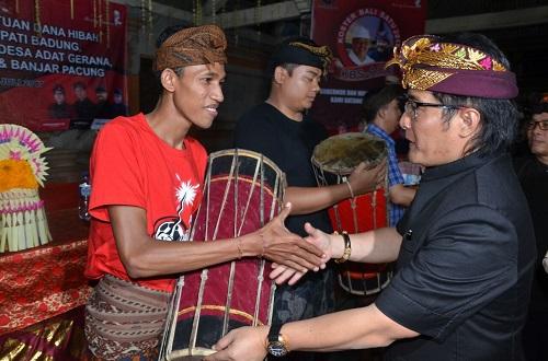 Bupati Badung I Nyoman Giri Prasta menyerahkan dana hibah sebesar Rp. 5 Miliar dan 8 barung gamelan Bleganjur di Desa Adat Sangeh, Kecamatan Abiansemal, Senin (10/7). Dana hibah Rp 5 M tersebut untuk mendukung p...